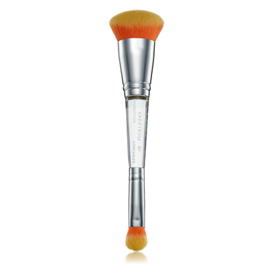 Makeup brush with black bristle tip and gold and beige handle on a white background