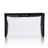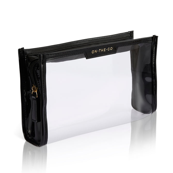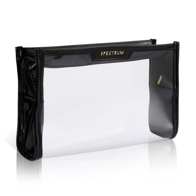Crafted from high-shine patent black fabric, this bag combines functionality with a sleek, elevated look. Finished with a black zip pull and elegant gold hardware, it brings a modern, luxe feel to your beauty routine. The clear PU panels make it easy to locate your products at a glance — no more rummaging for that one lipstick or brush hiding at the bottom of your bag.