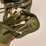 Each of the 25 brushes is meticulously made with luxe, cream-colored synthetic bristles, complemented by elegant, pale gold-hued copper ferrules for durability and sophistication. The glossy olive-toned handles, made from FSC-certified sustainable materials, feature a sleek tapered design that provides ultimate control.